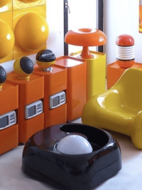 Mais revenons à la couleur, dont l’éclat illumine tout particuliérement les volumes d’architecture et les éléments de décoration. J’adore les années 1960 et 1970, où l’orange occupe toute sa place : moquettes chaleureuses, lampes design comme le modèle « Nesso », en forme de champignon, dessinée par Giancarlo Mattioli pour la maison Artemide. Un classique coloré, dont on apprécie la gaieté acidulée. Même maintenant, nous chérissons la gaieté vibrante que ce classique intemporel continue d’apporter. D’autres modèles existent, comme ceux présentés dans cet AD article